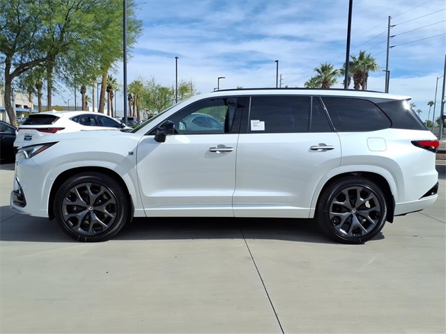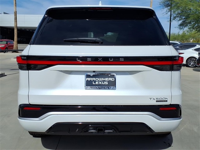 This Lexus TX is equipped with the following features: Accessory Package (2T) (All-Weather Cargo Mat and All-Weather Floor Liners), Convenience Package (Digital Key, Front Cross-Traffic Alert & Lane Change Assist, and Traffic Jam Assist), Technology Package (Advanced Park w/Remote Park and Panoramic View Monitor), I4 Hybrid, 120V/1500-Watt AC Power Outlet, 3rd row seats: split-bench, 4-Wheel Disc Brakes, ABS brakes, Adaptive suspension, Air Conditioning, Alloy wheels, AM/FM radio, Apple CarPlay/Android Auto, Auto High-beam Headlights, Auto tilt-away steering wheel, Auto-dimming door mirrors, Auto-dimming Rear-View mirror, Automatic temperature control, Brake assist, Bumpers: body-color, Cargo Net, Delay-off headlights, Driver door bin, Driver vanity mirror, Dual front impact airbags, Dual front side impact airbags, Electronic Stability Control, Emergency communication system: Safety Connect (5-year minimum), Exterior Parking Camera Rear, F SPORT Heated & Ventilated Front Seats, Four wheel independent suspension, Front & Rear Mudguards, Front anti-roll bar, Front Bucket Seats, Front Center Armrest, Front dual zone A/C, Front fog lights, Front reading lights, Fully automatic headlights, Garage door transmitter: HomeLink, Headlight cleaning, Heated door mirrors, Heated front seats, Heated rear seats, Heated steering wheel, Illuminated Door Sills w/Lexus Logo, Illuminated entry, Key Gloves w/Embossed Lexus Logo, Knee airbag, Leather Shift Knob, Leather steering wheel, Lexus Interface w/14" Touchscreen Display, Low tire pressure warning, Memory seat, Navigation system: Drive Connect Cloud Navigation (3-year trial subscription included), Occupant sensing airbag, Outside temperature display, Overhead airbag, Panic alarm, Passenger door bin, Passenger vanity mirror, Power door mirrors, Power driver seat, Power Liftgate, Power passenger seat, Power steering, Power windows, Radio data system, Rain sensing wipers, Rear air conditioning, Rear anti-roll bar, Rear reading lights, Rear window defroster, Rear window wiper, Reclining 3rd row seat, Remote keyless entry, Security system, Speed control, Speed-sensing steering, Split folding rear seat, Spoiler, Steering wheel memory, Steering wheel mounted audio controls, Telescoping steering wheel, Tilt steering wheel, Tow Hitch Receiver, Traction control, Trip computer, Turn signal indicator mirrors, Variably intermittent wipers, Ventilated front seats, Ventilated rear seats, and Wheels: 22" Split 5-Spoke Alloy.