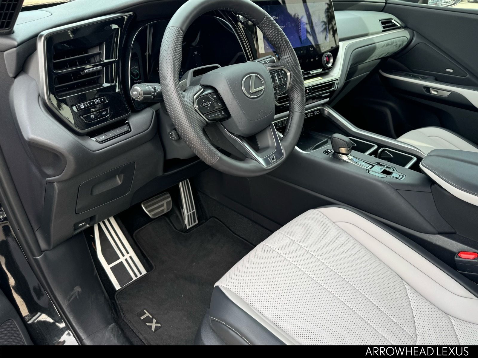 This Lexus TX is equipped with the following features: Convenience Package (Digital Key and Traffic Jam Assist), Technology Package (Advanced Park w/Remote Park and Panoramic View Monitor), 2.4L I4 PDI Hybrid Turbocharged DOHC 16V, 12 Speakers, 120V/1500-Watt AC Power Outlet, 3rd row seats: split-bench, 4-Wheel Disc Brakes, ABS brakes, Adaptive suspension, Air Conditioning, Alloy wheels, AM/FM radio, Apple CarPlay/Android Auto, Auto High-beam Headlights, Auto tilt-away steering wheel, Auto-dimming door mirrors, Auto-dimming Rear-View mirror, Automatic temperature control, Brake assist, Bumpers: body-color, Dashcam, Delay-off headlights, Door Edge Film by 3M, Driver door bin, Driver vanity mirror, Dual front impact airbags, Dual front side impact airbags, Electronic Stability Control, Emergency communication system: Safety Connect (5-year minimum), Exterior Parking Camera Rear, F SPORT Bumper Cover, F SPORT Heated and Ventilated Front Seats, Four wheel independent suspension, Front anti-roll bar, Front Bucket Seats, Front Center Armrest, Front dual zone A/C, Front fog lights, Front reading lights, Fully automatic headlights, Garage door transmitter: HomeLink, Headlight cleaning, Heated door mirrors, Heated front seats, Heated rear seats, Heated steering wheel, Illuminated Door Sills with Lexus Logo, Illuminated entry, Knee airbag, Leather Shift Knob, Leather steering wheel, Lexus Interface with 14" Touchscreen Display, Low tire pressure warning, Mark Levinson 21-Speaker PurePlay Surround Sound, Memory seat, Navigation system: Drive Connect Cloud Navigation (3-year trial subscription included), NuLuxe Seat Trim, Occupant sensing airbag, Outside temperature display, Overhead airbag, Panic alarm, Passenger door bin, Passenger vanity mirror, Power door mirrors, Power driver seat, Power Liftgate, Power passenger seat, Power steering, Power windows, Radio data system, Radio: 12-Speaker Lexus Premium Sound System, Rain sensing wipers, Rear air conditioning, Rear anti-roll bar, Rear reading lights, Rear window defroster, Rear window wiper, Reclining 3rd row seat, Remote keyless entry, Security system, Speed control, Speed-sensing steering, Split folding rear seat, Spoiler, Steering wheel memory, Steering wheel mounted audio controls, Telescoping steering wheel, Tilt steering wheel, Tow Hitch Receiver, Traction control, Trip computer, Turn signal indicator mirrors, Variably intermittent wipers, Ventilated front seats, Ventilated rear seats, and Wheels: 22" Split 5-Spoke Alloy.