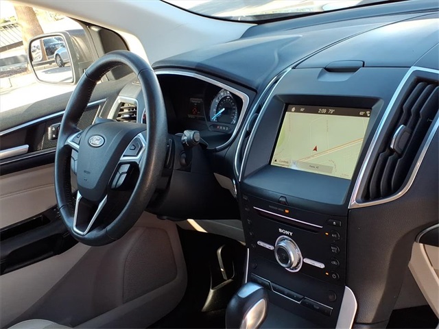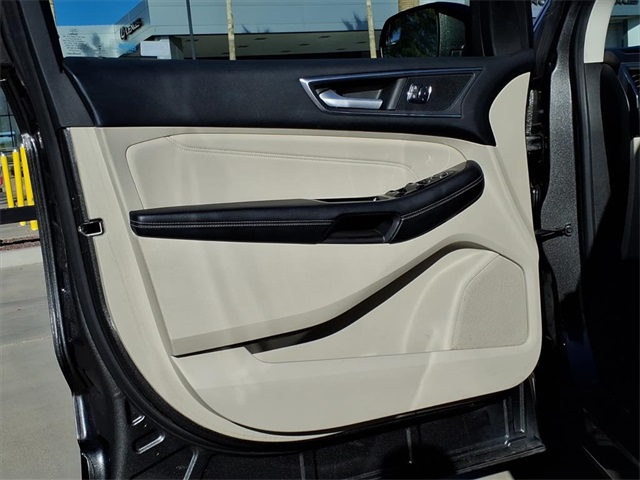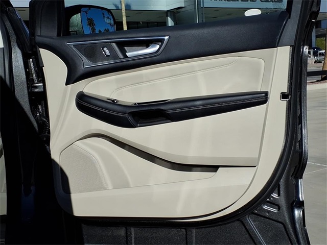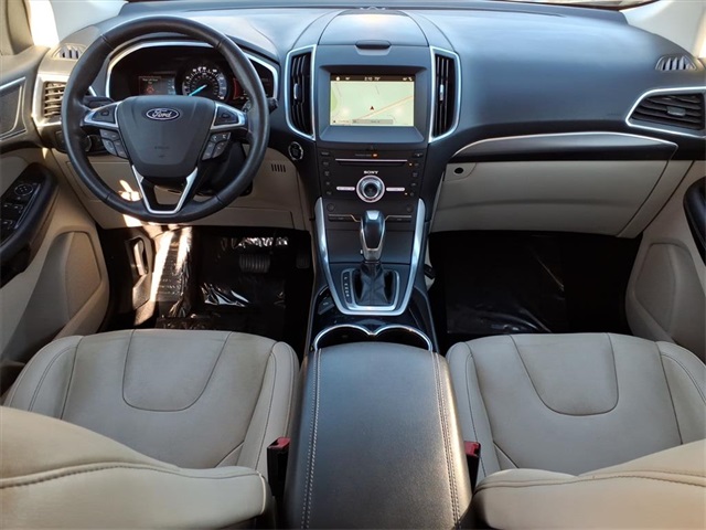 This Ford Edge is equipped with the following features: Equipment Group 300A, Technology Package (110V/150W AC Power Outlet, Remote Start System, SiriusXM Traffic & Travel Link, and Voice-Activated Touchscreen Navigation System), AWD, 12 Speakers, 3.36 Axle Ratio, 4-Wheel Disc Brakes, ABS brakes, Air Conditioning, Alloy wheels, AM/FM radio: SiriusXM, AM/FM Stereo w/Single CD Player, Apple CarPlay/Android Auto, Auto-dimming Rear-View mirror, Automatic temperature control, Brake assist, Bumpers: body-color, CD player, Compass, Delay-off headlights, Driver door bin, Driver vanity mirror, Dual front impact airbags, Dual front side impact airbags, Electronic Stability Control, Emergency communication system: SYNC 3 911 Assist, Exterior Parking Camera Rear, Four wheel independent suspension, Front anti-roll bar, Front Bucket Seats, Front Center Armrest w/Storage, Front dual zone A/C, Front License Plate Bracket, Front reading lights, Fully automatic headlights, Garage door transmitter, Heated door mirrors, Heated front seats, Illuminated entry, Knee airbag, Leather Shift Knob, Leather-Trimmed Heated Sport Bucket Seats, Low tire pressure warning, Memory seat, Occupant sensing airbag, Outside temperature display, Overhead airbag, Overhead console, Panic alarm, Panoramic Vista Roof, Passenger door bin, Passenger vanity mirror, Power door mirrors, Power driver seat, Power Liftgate, Power passenger seat, Power steering, Power windows, Premium audio system: Sony, Rear anti-roll bar, Rear Parking Sensors, Rear reading lights, Rear seat center armrest, Rear window defroster, Rear window wiper, Remote keyless entry, Security system, SiriusXM Radio, Speed control, Speed-Sensitive Wipers, Split folding rear seat, Spoiler, Steering wheel mounted audio controls, SYNC 3 Communications & Entertainment System, Tachometer, Telescoping steering wheel, Tilt steering wheel, Traction control, Trip computer, Turn signal indicator mirrors, Variably intermittent wipers, and Wheels: 19" Nickel-Painted Aluminum.