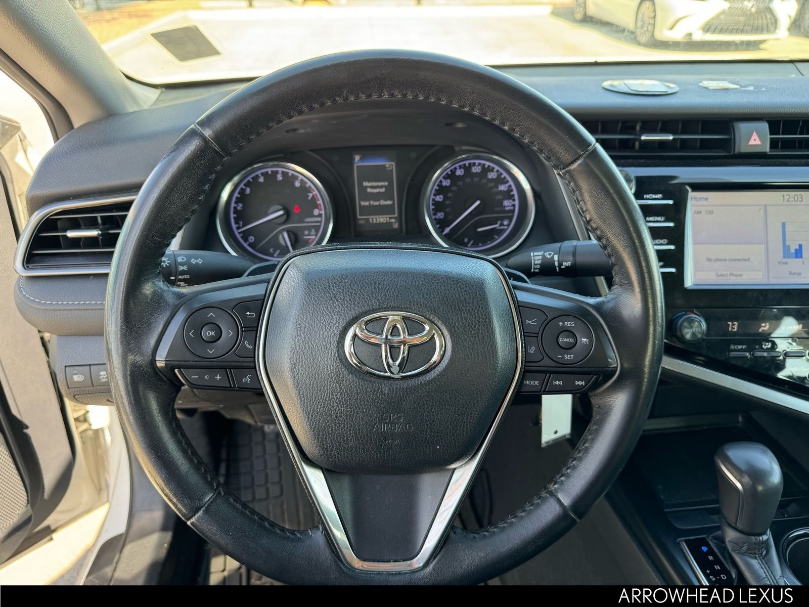 This Toyota Camry is equipped with the following features: Black w/Fabric Seat Trim w/SofTex, 4-Wheel Disc Brakes, 6 Speakers, ABS brakes, Air Conditioning, Alloy wheels, AM/FM radio, Apple CarPlay, Auto High-beam Headlights, Automatic temperature control, Brake assist, Bumpers: body-color, Delay-off headlights, Driver door bin, Driver vanity mirror, Dual front impact airbags, Dual front side impact airbags, Electronic Stability Control, Emergency communication system: Safety Connect, Exterior Parking Camera Rear, Fabric Seat Trim w/SofTex, Four wheel independent suspension, Front anti-roll bar, Front Bucket Seats, Front Bucket Sport Seats, Front Center Armrest, Front reading lights, Fully automatic headlights, Illuminated entry, Knee airbag, Leather Shift Knob, Low tire pressure warning, Occupant sensing airbag, Outside temperature display, Overhead airbag, Overhead console, Panic alarm, Passenger door bin, Passenger vanity mirror, Power door mirrors, Power driver seat, Power steering, Power windows, Radio data system, Radio: Entune 3.0 Audio w/App Suite, Rear anti-roll bar, Rear reading lights, Rear seat center armrest, Rear side impact airbag, Rear window defroster, Remote keyless entry, Security system, Speed control, Speed-sensing steering, Split folding rear seat, Spoiler, Sport steering wheel, Steering wheel mounted audio controls, Tachometer, Telescoping steering wheel, Tilt steering wheel, Traction control, Trip computer, Variably intermittent wipers, and Wheels: 8.0J x 18" Black Machined-Finish Alloy.