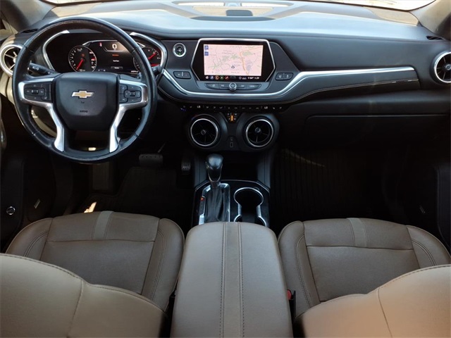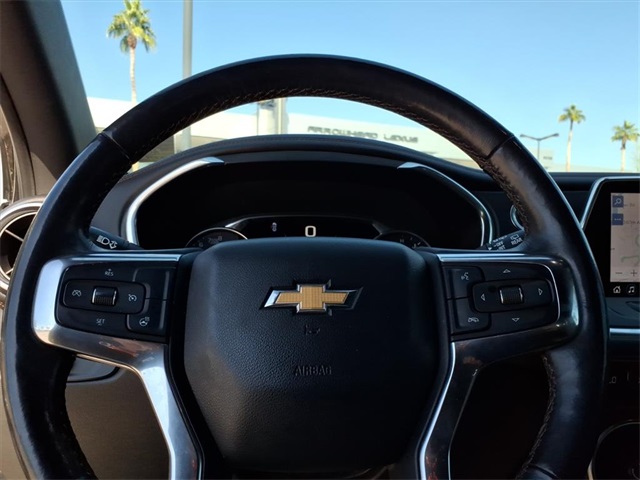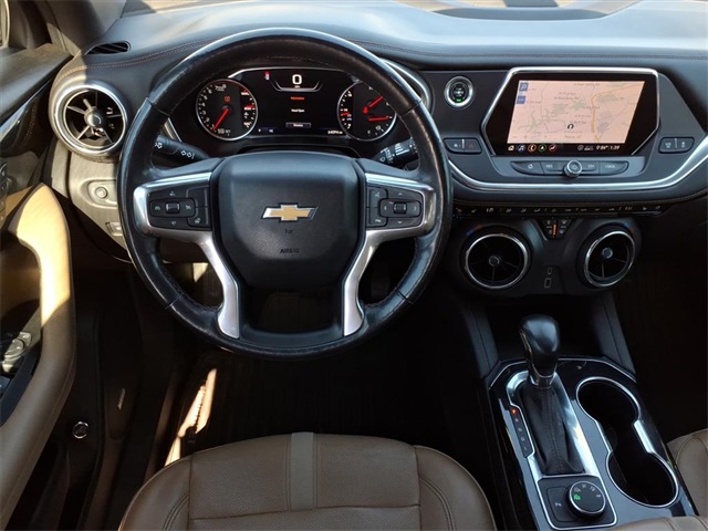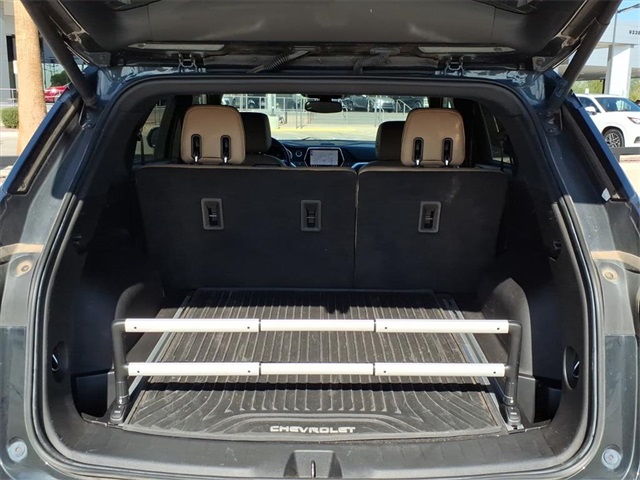 This Chevrolet Blazer is equipped with the following features: Interior Protection Package (LPO) (Premium All-Weather Cargo Mat (LPO) and Premium All-Weather Floor Mats), Preferred Equipment Group 0HD, Trailering Equipment (Heavy-Duty Cooling System, Hitch Guidance, and Hitch Guidance w/Hitch View), AWD, 170 Amp Alternator, 3.49 Final Drive Axle Ratio, 4-Wheel Disc Brakes, 6-Way Power Front Passenger Seat Adjuster, 8 Speakers, ABS brakes, Air Conditioning, Alloy wheels, AM/FM radio: SiriusXM, Apple CarPlay/Android Auto, Auto tilt-away steering wheel, Auto-dimming door mirrors, Auto-dimming Rear-View mirror, Automatic temperature control, Bose Premium 8-Speaker Audio System Feature, Brake assist, Bumpers: body-color, Child-Seat-Sensing Airbag, Compass, Delay-off headlights, Driver door bin, Driver vanity mirror, Dual front impact airbags, Dual front side impact airbags, Electronic Stability Control, Emergency communication system: OnStar and Chevrolet connected services capable, Exterior Parking Camera Rear, Four wheel independent suspension, Front anti-roll bar, Front Bucket Seats, Front Center Armrest, Front dual zone A/C, Front reading lights, Fully automatic headlights, Garage door transmitter, Heated door mirrors, Heated Driver & Front Passenger Seats, Heated front seats, Heated rear seats, Heated steering wheel, High-Intensity Discharge Headlights, Illuminated entry, Knee airbag, Leather Shift Knob, Low tire pressure warning, Memory seat, Memory Settings For Driver Seat & Exterior Mirrors, Navigation System, Occupant sensing airbag, Outside temperature display, Overhead airbag, Overhead console, Panic alarm, Passenger door bin, Passenger vanity mirror, Perforated Leather-Appointed Seat Trim, Power door mirrors, Power driver seat, Power Liftgate, Power Panoramic Tilt-Sliding Sunroof, Power passenger seat, Power steering, Power windows, Radio data system, Radio: Chevrolet Infotainment 3 Premium System, Rear anti-roll bar, Rear reading lights, Rear seat center armrest, Rear window defroster, Rear window wiper, Remote keyless entry, Ride & Handling Suspension, Security system, SiriusXM w/360L, Speed control, Speed-sensing steering, Split folding rear seat, Spoiler, Steering wheel memory, Steering wheel mounted audio controls, Tachometer, Telescoping steering wheel, Tilt steering wheel, Traction control, Trip computer, Turn signal indicator mirrors, Variably intermittent wipers, Ventilated Driver & Front Passenger Seats, Ventilated front seats, Voltmeter, Wheels: 20" Medium Android Machined-Face Aluminum, and Wheels: 21" Pearl Nickel Aluminum.