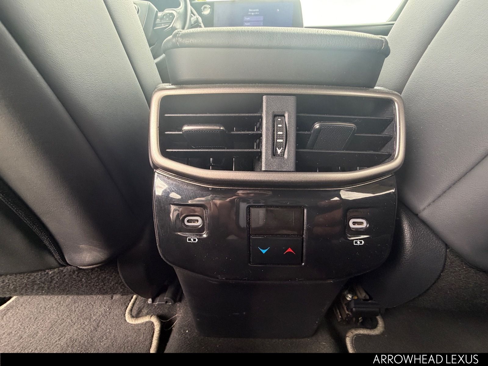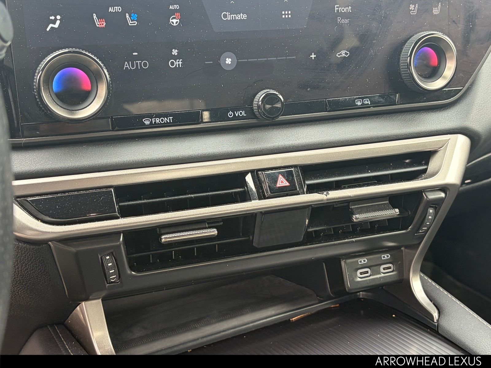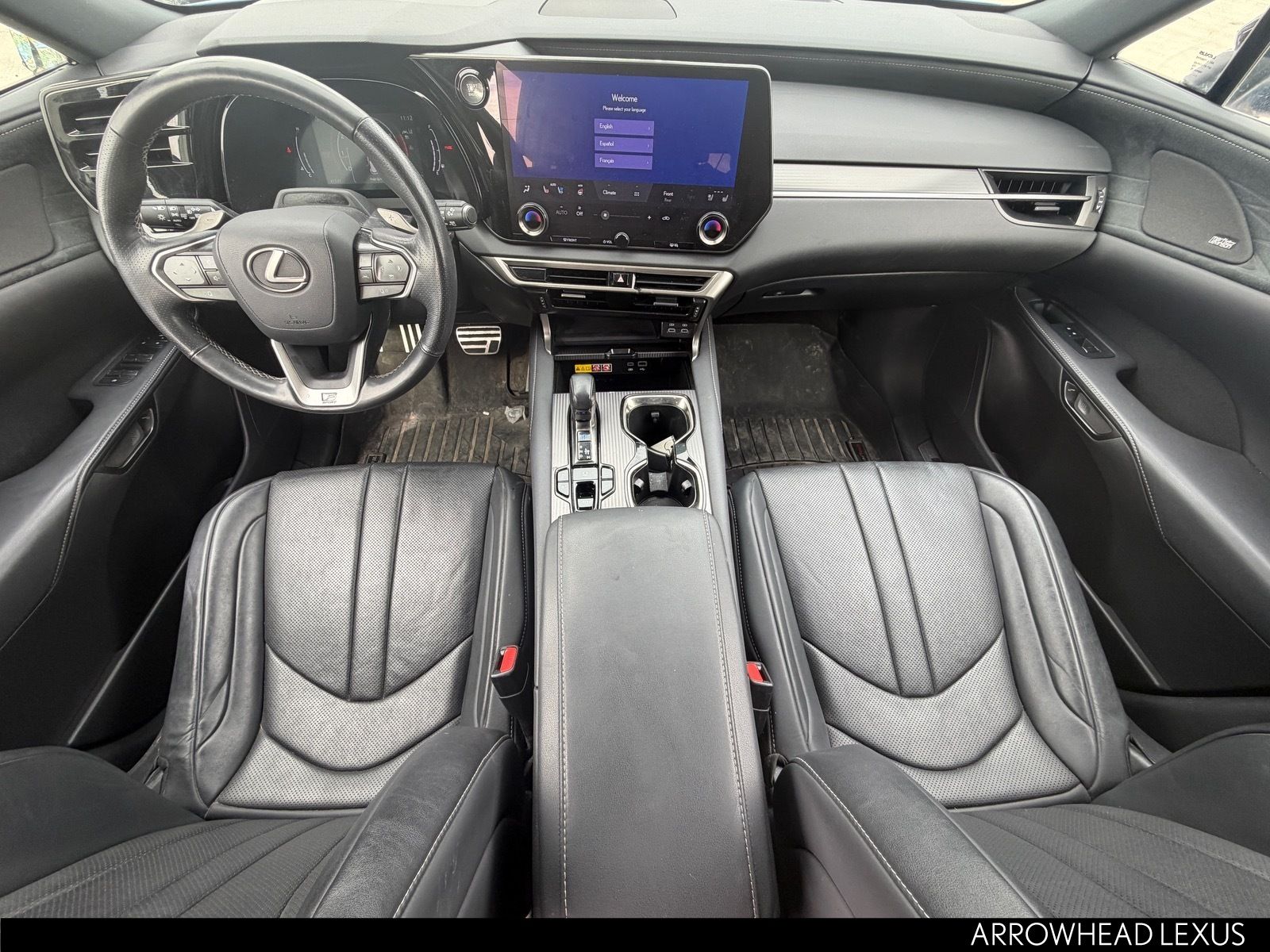 This Lexus RX is equipped with the following features: F SPORT Handling Package (8-Way Power Driver & Front Passenger Seat Adjusters, F SPORT White Steering Wheel w/Paddle, Finish Plate Door Inner Garnish, Front Seat Air Conditioner, Head-Up Display (HUD), Multi-Color Illuminated Entry System, Parking Support Alert/Brake, and Wireless Charger), AWD, Black w/Dark Graphite Aluminum w/Leather/Ultra Suede Seat Trim, 12 Speakers, 3.33 Axle Ratio, 4-Wheel Disc Brakes, ABS brakes, Adaptive suspension, Air Conditioning, Alloy wheels, AM/FM radio: SiriusXM, Anti-whiplash front head restraints, Auto High-beam Headlights, Auto tilt-away steering wheel, Auto-dimming door mirrors, Auto-dimming Rear-View mirror, Auto-leveling suspension, Automatic temperature control, Brake assist, Bumpers: body-color, Compass, Delay-off headlights, Driver door bin, Driver vanity mirror, Dual front impact airbags, Dual front side impact airbags, Electronic Stability Control, Emergency communication system: Safety Connect (10-year trial), Exterior Parking Camera Rear, F SPORT NuLuxe Seat Trim, Four wheel independent suspension, Front anti-roll bar, Front Bucket Seats, Front Center Armrest, Front dual zone A/C, Front fog lights, Front reading lights, Fully automatic headlights, Garage door transmitter: HomeLink, Genuine wood console insert, Heads-Up Display, Heated & Ventilated Front Bucket Seats, Heated door mirrors, Heated front seats, Illuminated entry, Leather Shift Knob, Low tire pressure warning, Memory seat, Navigation System, Occupant sensing airbag, Outside temperature display, Overhead airbag, Overhead console, Panic alarm, Passenger door bin, Passenger vanity mirror, Power door mirrors, Power driver seat, Power Liftgate, Power moonroof, Power passenger seat, Power steering, Power windows, Radio data system, Radio: Lexus Interface w/9.8" HD Touchscreen Display, Rain sensing wipers, Rear air conditioning, Rear anti-roll bar, Rear reading lights, Rear seat center armrest, Rear side impact airbag, Rear window defroster, Rear window wiper, Remote keyless entry, Security system, Speed control, Speed-sensing steering, Split folding rear seat, Spoiler, Sport steering wheel, Steering wheel memory, Steering wheel mounted audio controls, Tachometer, Telescoping steering wheel, Tilt steering wheel, Traction control, Trip computer, Turn signal indicator mirrors, Variably intermittent wipers, Ventilated front seats, Wheels: 21", and Wireless Apple CarPlay/Wireless Android Auto.