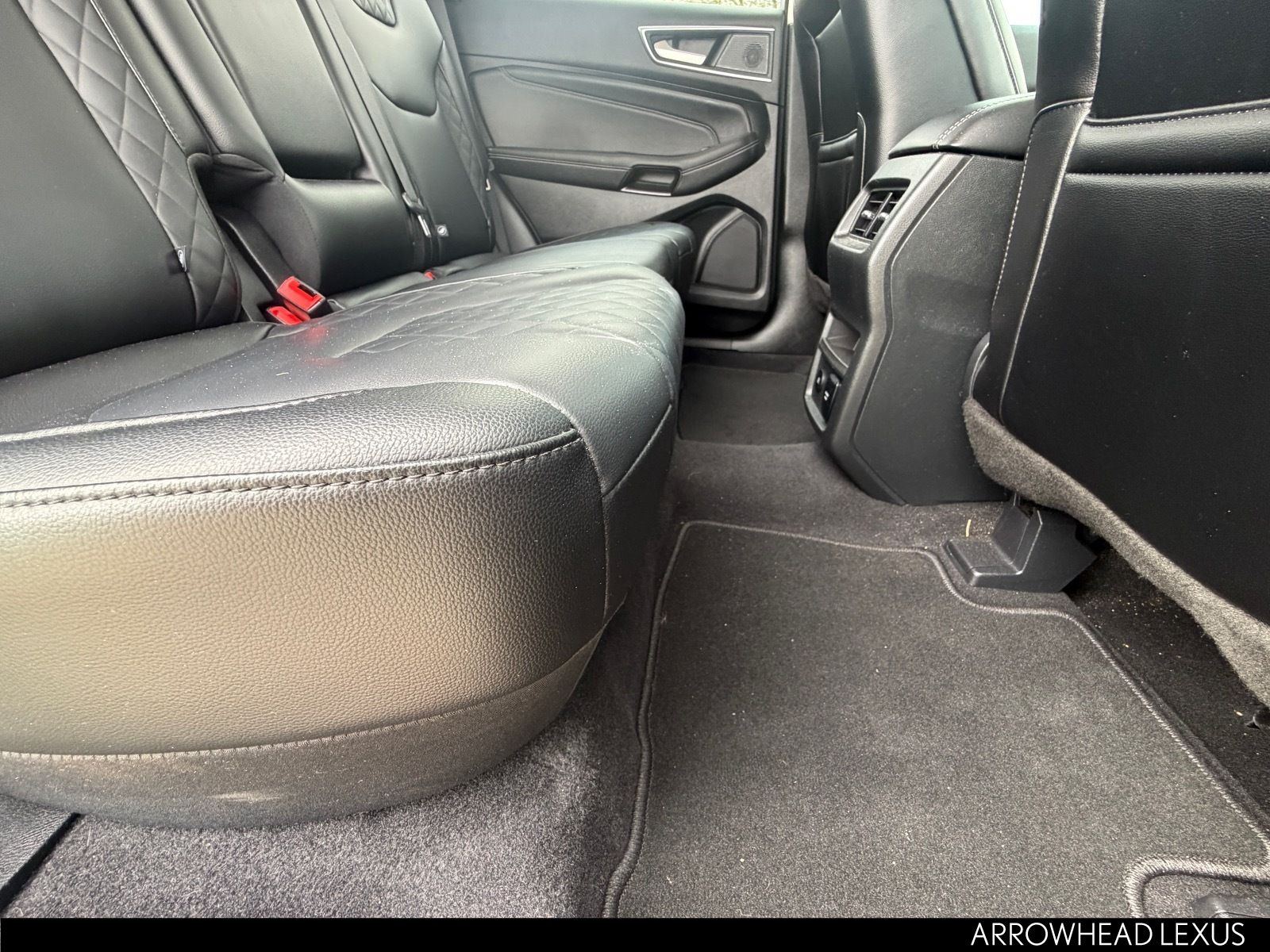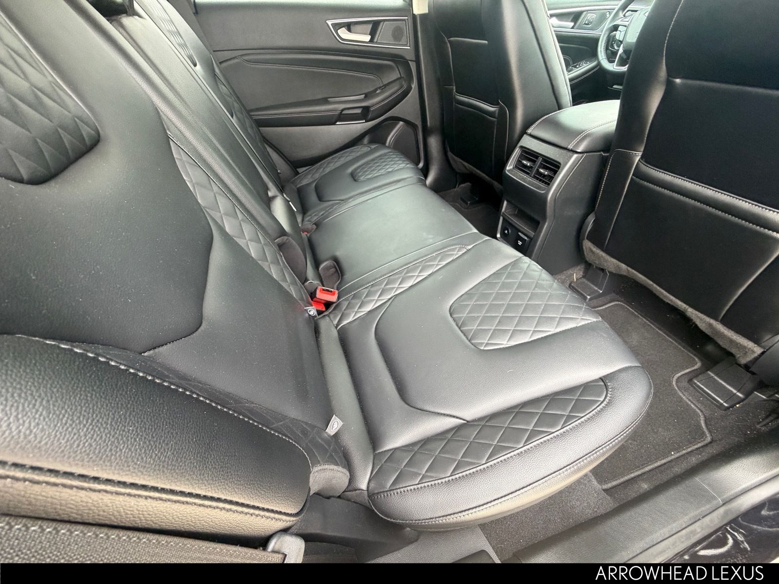 This Ford Edge is equipped with the following features: Equipment Group 300A, AWD, 12 Speakers, 3.80 Axle Ratio, 4-Wheel Disc Brakes, ABS brakes, ActiveX-Trimmed Heated Sport Bucket Seats, Air Conditioning, Alloy wheels, AM/FM radio: SiriusXM with 360L, Auto High-beam Headlights, Auto-dimming Rear-View mirror, Automatic temperature control, Brake assist, Bumpers: body-color, Compass, Delay-off headlights, Driver door bin, Driver vanity mirror, Dual front impact airbags, Dual front side impact airbags, Electronic Stability Control, Emergency communication system: SYNC 4 911 Assist, FordPass Connect, Four wheel independent suspension, Front anti-roll bar, Front Bucket Seats, Front Center Armrest w/Storage, Front dual zone A/C, Front fog lights, Front reading lights, Fully automatic headlights, Garage door transmitter, Heated door mirrors, Heated front seats, Heated steering wheel, Illuminated entry, Knee airbag, Leather steering wheel, Low tire pressure warning, Memory seat, Occupant sensing airbag, Outside temperature display, Overhead airbag, Overhead console, Panic alarm, Passenger door bin, Passenger vanity mirror, Power door mirrors, Power driver seat, Power Liftgate, Power passenger seat, Power steering, Power windows, Radio: B&O Sound System by Bang & Olufsen, Rain sensing wipers, Rear anti-roll bar, Rear reading lights, Rear seat center armrest, Rear window defroster, Rear window wiper, Remote keyless entry, Security system, SiriusXM w/360L, Speed control, Speed-Sensitive Wipers, Split folding rear seat, Spoiler, Steering wheel mounted audio controls, SYNC 4A w/Enhanced Voice Recognition, Tachometer, Telescoping steering wheel, Tilt steering wheel, Traction control, Trip computer, Turn signal indicator mirrors, Variably intermittent wipers, and Wheels: 19" Luster Nickel-Painted Aluminum.