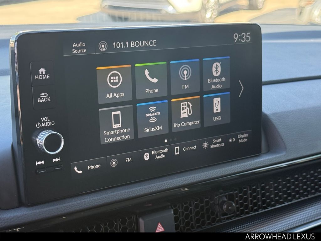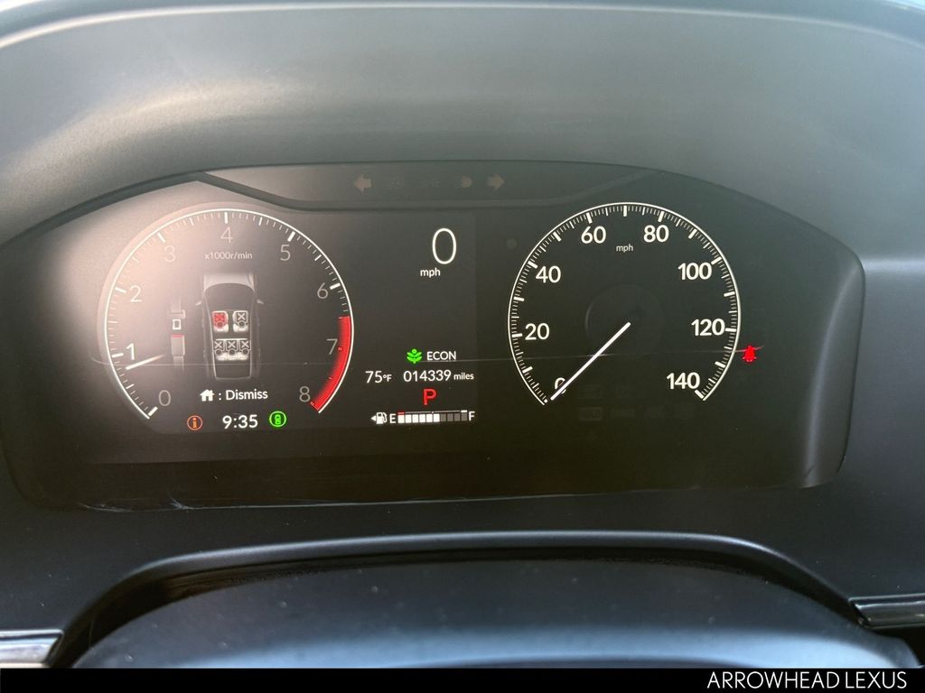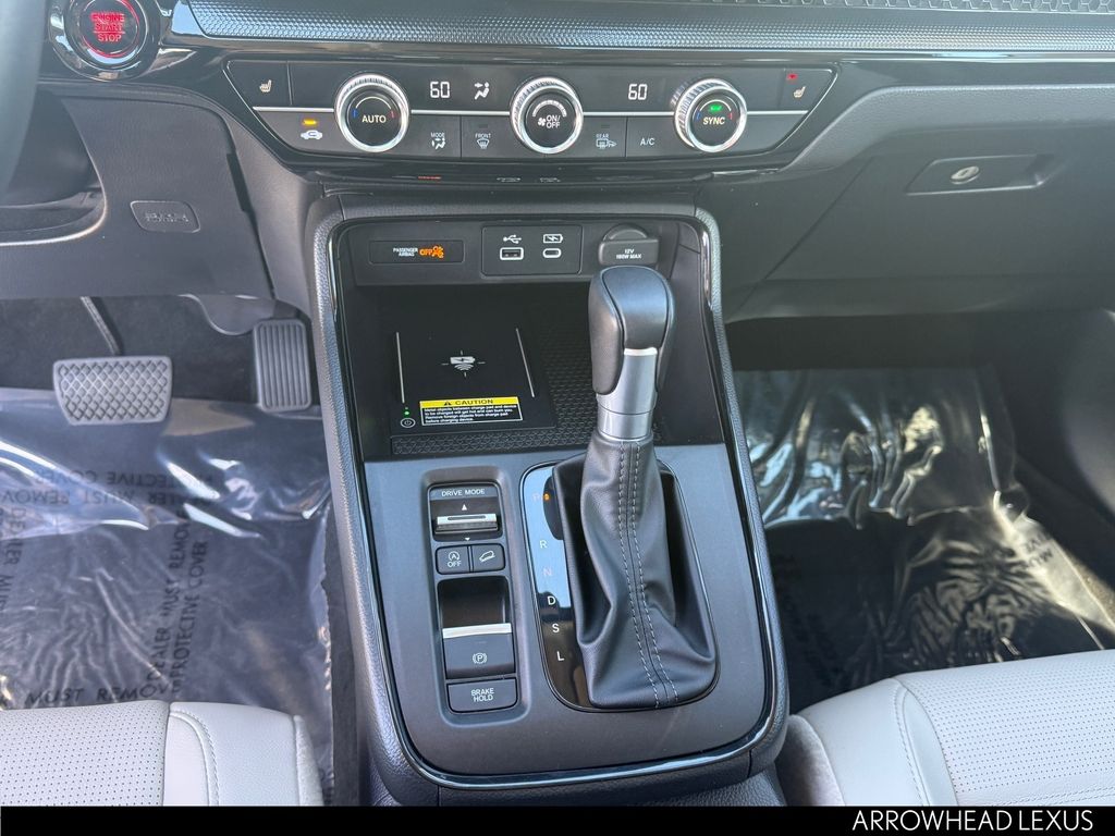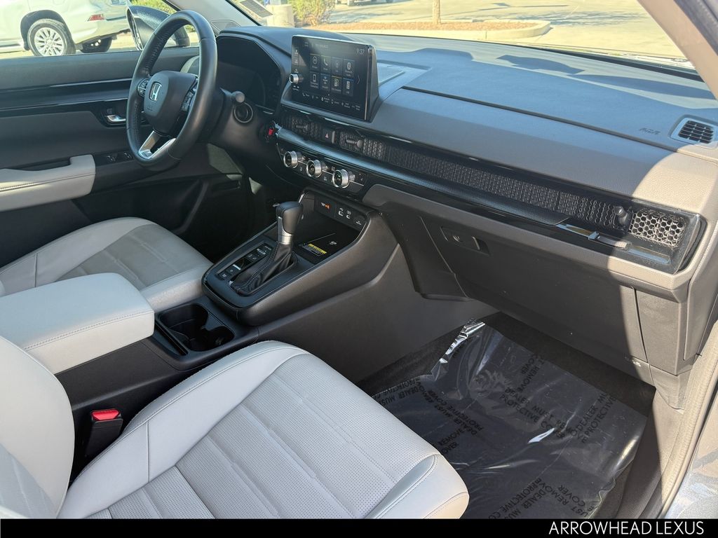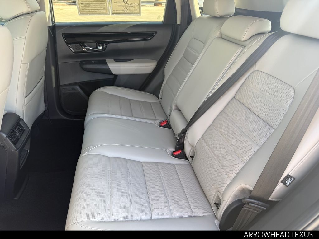 This Honda CR-V is equipped with the following features: 4-Wheel Disc Brakes, 5.64 Axle Ratio, 8 Speakers, ABS brakes, Adaptive Cruise Control: Adaptive Cruise Control (ACC) with Low-Speed Follow, Air Conditioning, Alloy wheels, AM/FM radio: SiriusXM, Auto High-beam Headlights, Auto-dimming Rear-View mirror, Automatic temperature control, Blind Spot Information (BSI) System warning, Brake assist, Bumpers: body-color, Compass, Delay-off headlights, Driver door bin, Driver vanity mirror, Dual front impact airbags, Dual front side impact airbags, Electronic Stability Control, Exterior Parking Camera Rear, Four wheel independent suspension, Front anti-roll bar, Front Bucket Seats, Front Center Armrest, Front dual zone A/C, Front reading lights, Fully automatic headlights, Heated door mirrors, Heated Front Bucket Seats, Heated front seats, Illuminated entry, Knee airbag, Leather Seat Trim, Leather Shift Knob, Leather steering wheel, Low tire pressure warning, Memory seat, Occupant sensing airbag, Outside temperature display, Overhead airbag, Overhead console, Panic alarm, Passenger door bin, Passenger vanity mirror, Power door mirrors, Power driver seat, Power Liftgate, Power moonroof, Power passenger seat, Power steering, Power windows, Radio data system, Radio: 320-Watt AM/FM/HD/SiriusXM Audio System, Rear anti-roll bar, Rear reading lights, Rear seat center armrest, Rear side impact airbag, Rear window defroster, Rear window wiper, Remote keyless entry, Security system, Speed control, Speed-sensing steering, Speed-Sensitive Wipers, Split folding rear seat, Spoiler, Steering wheel mounted audio controls, Tachometer, Telescoping steering wheel, Tilt steering wheel, Traction control, Trip computer, Turn signal indicator mirrors, Variably intermittent wipers, Wheels: 18" Sparkle Silver Metallic, and Wireless Apple CarPlay/Wireless Android Auto.