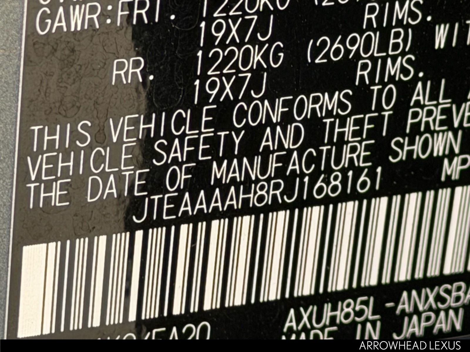 - VIN : JTEAAAAH8RJ168161